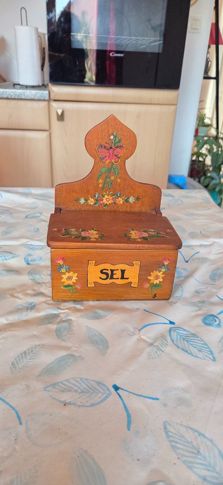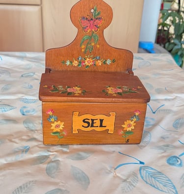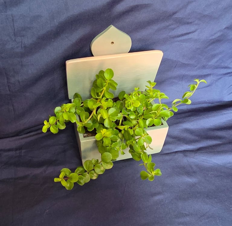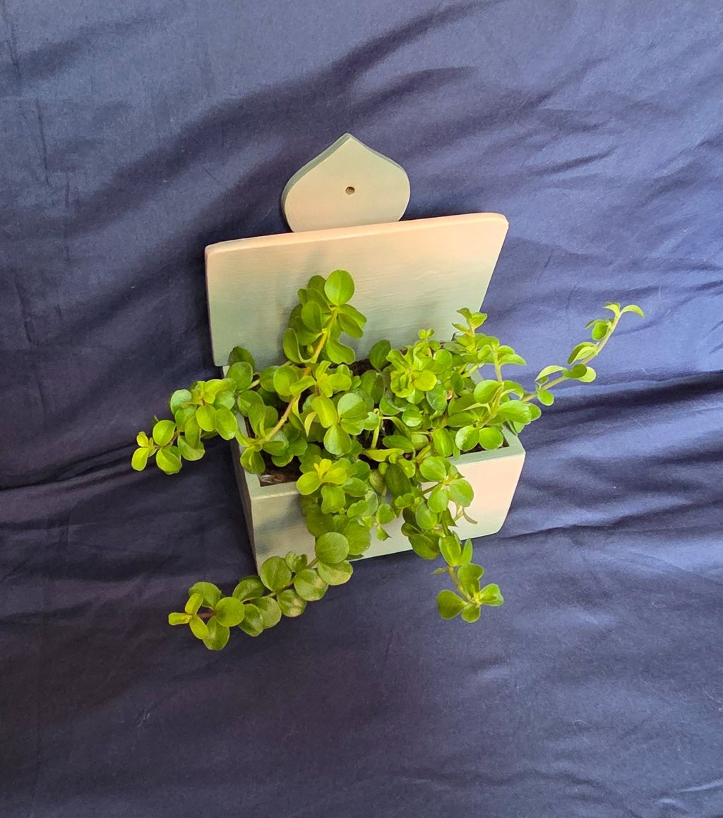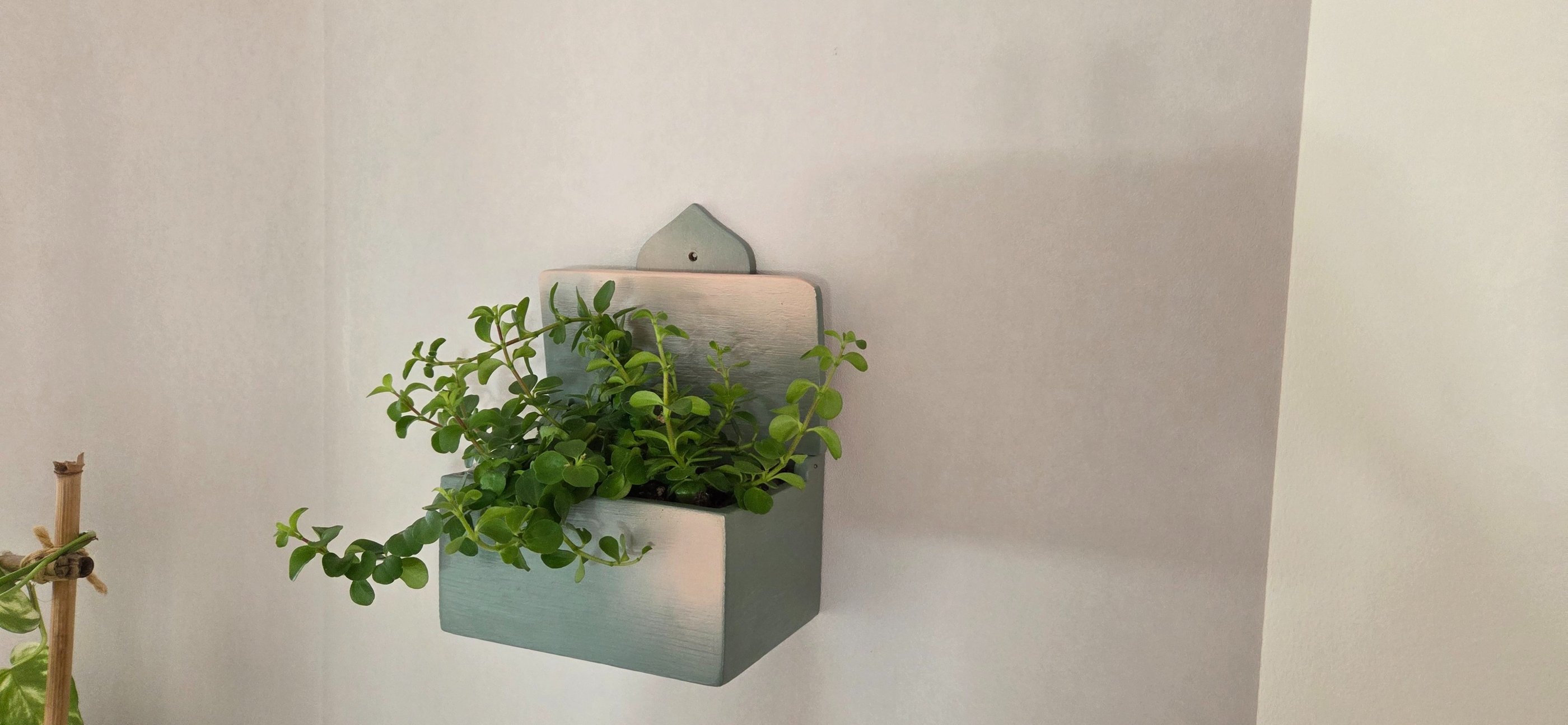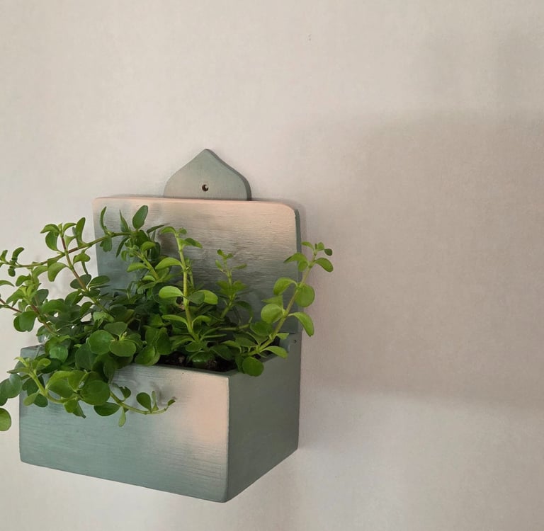 Une petite boîte à sel murale, sous-couche de peinture blanche et peinte en couleur "eucalyptus" et "rose ballerine".