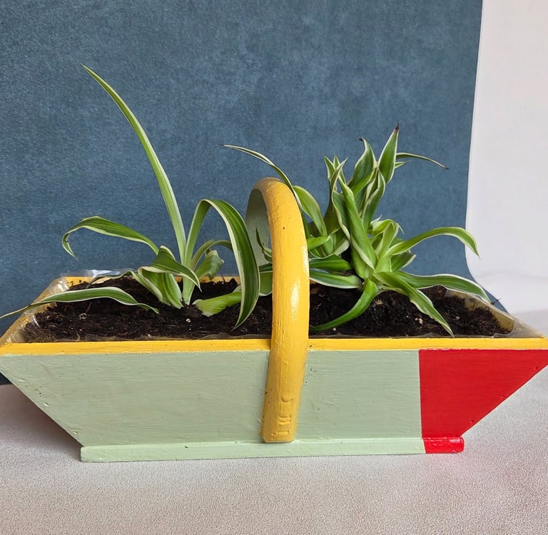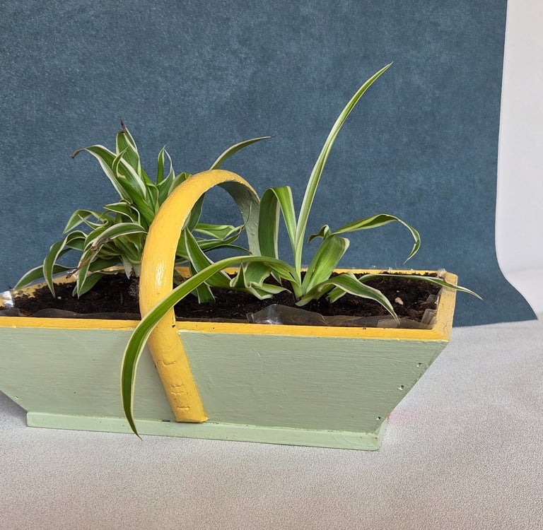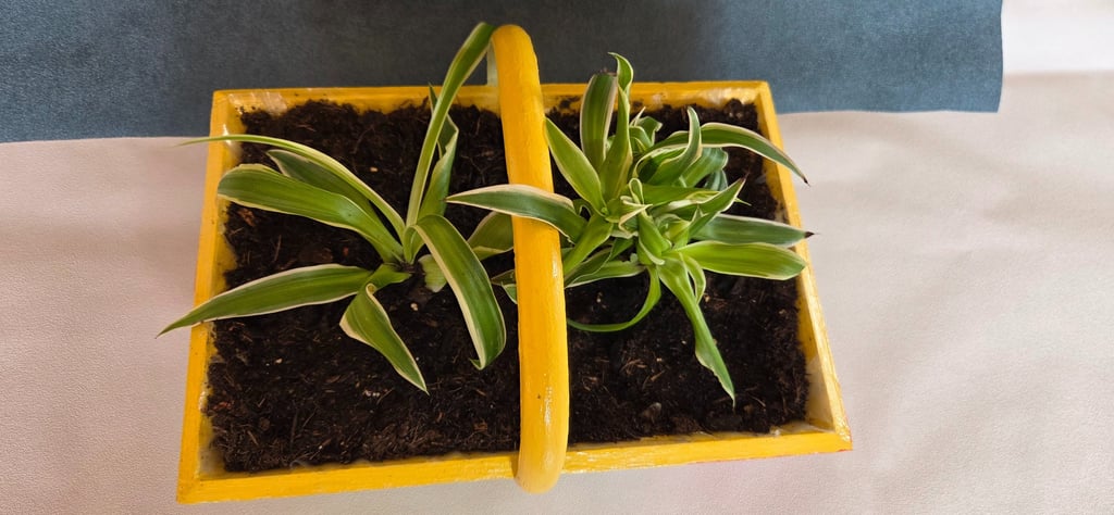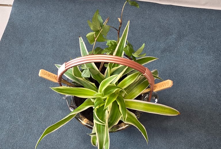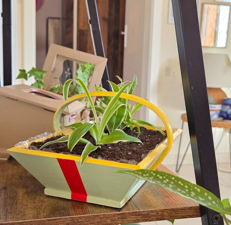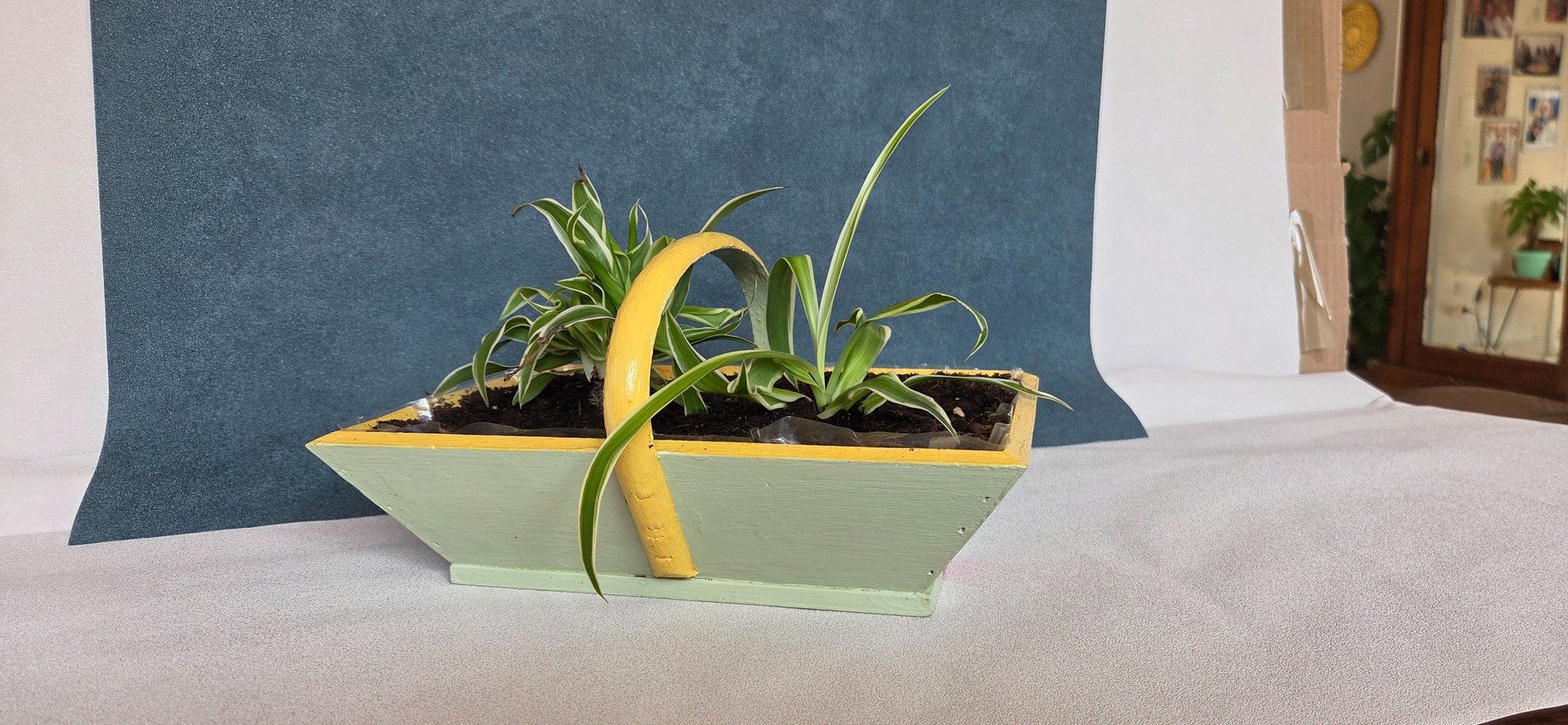 L'objet accueille un pied de "plante araignée" et du "lierre", des billes d'argiles et du terreau.