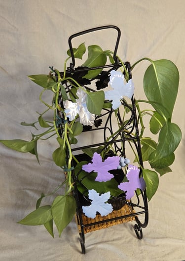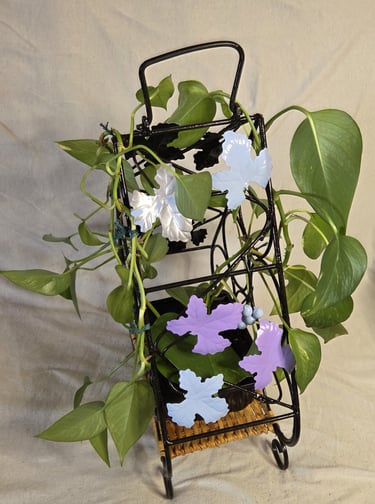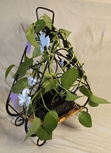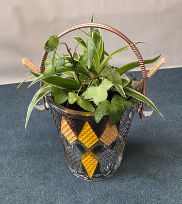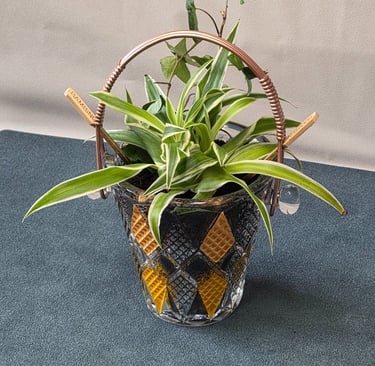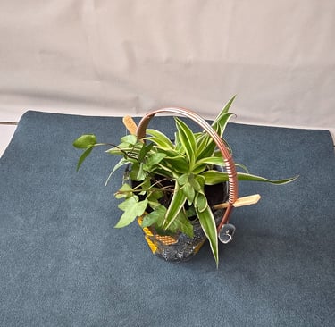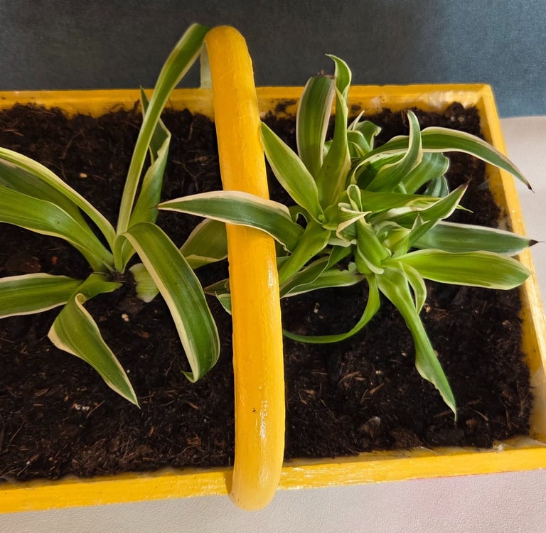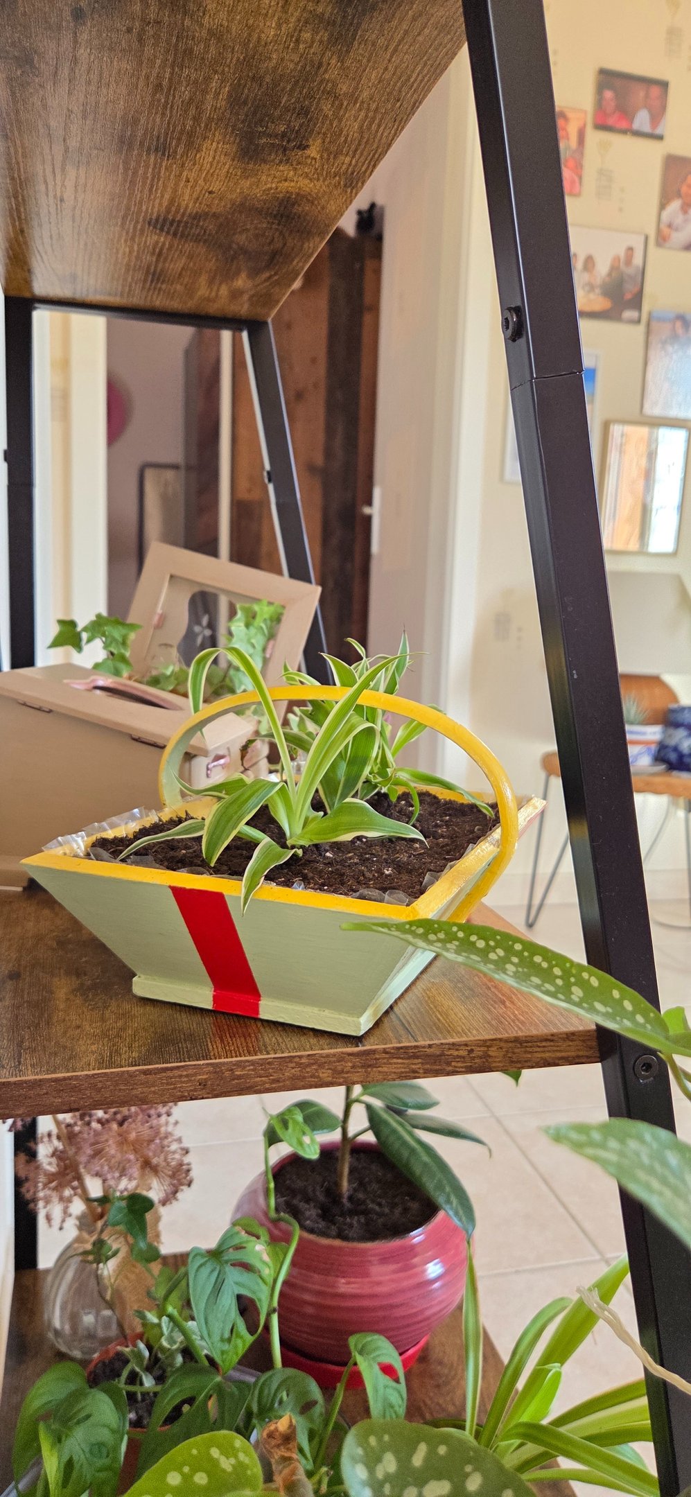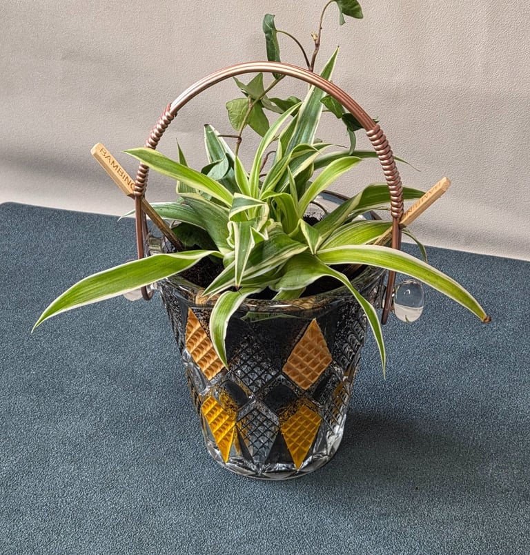 L'objet accueille un pied de "plante araignée" et du "lierre", des billes d'argiles et du terreau.