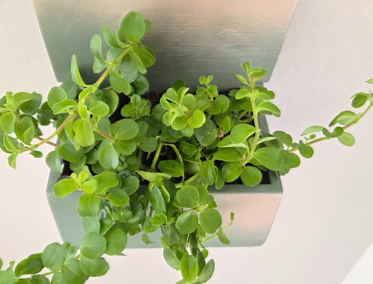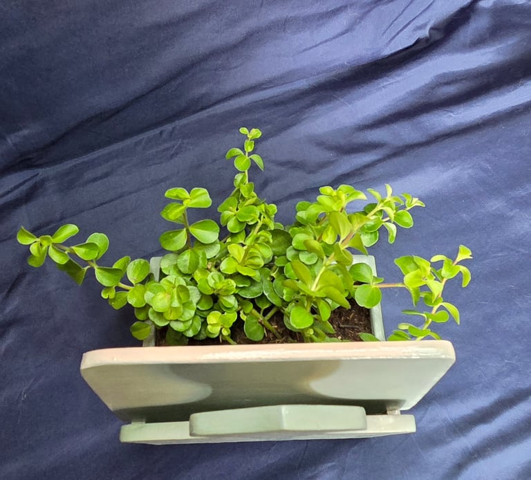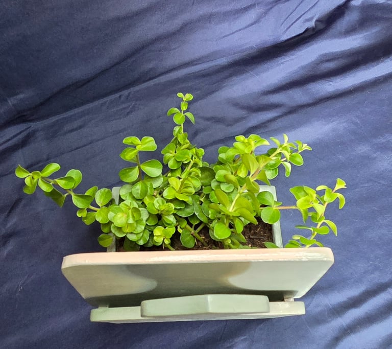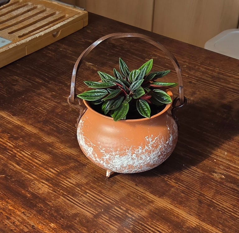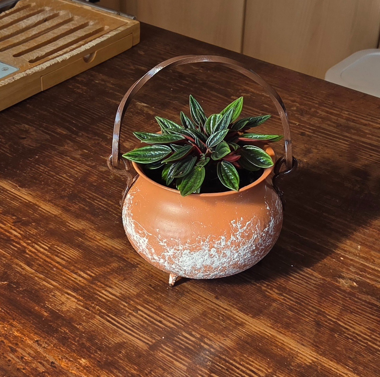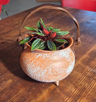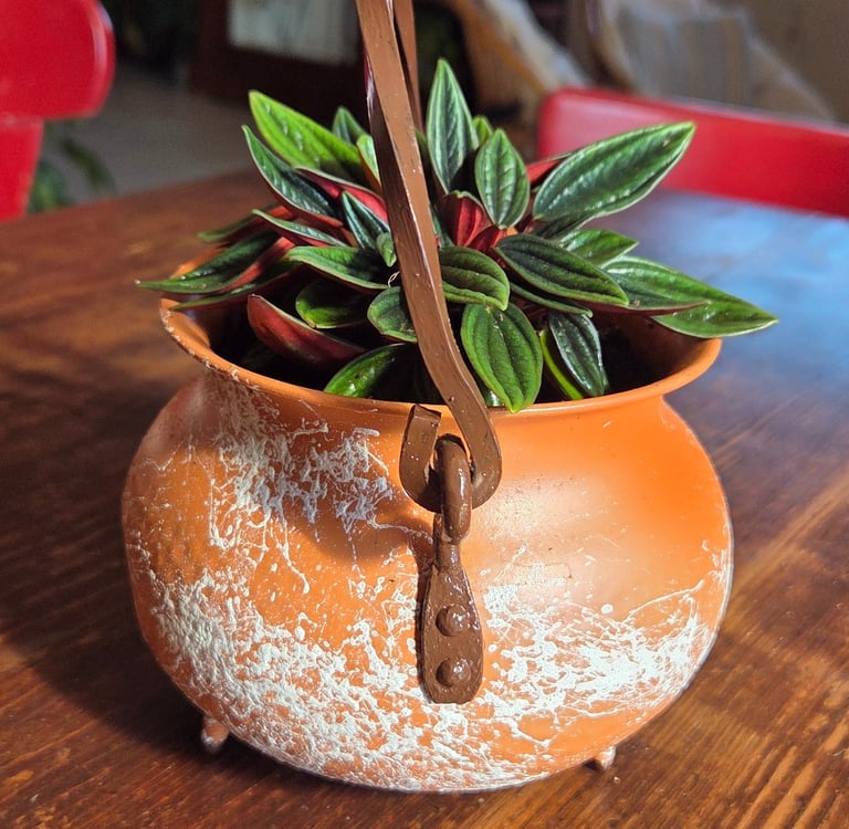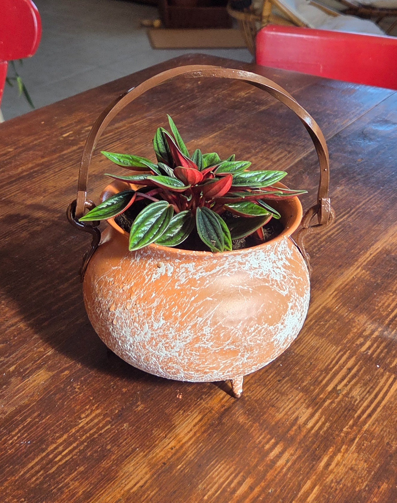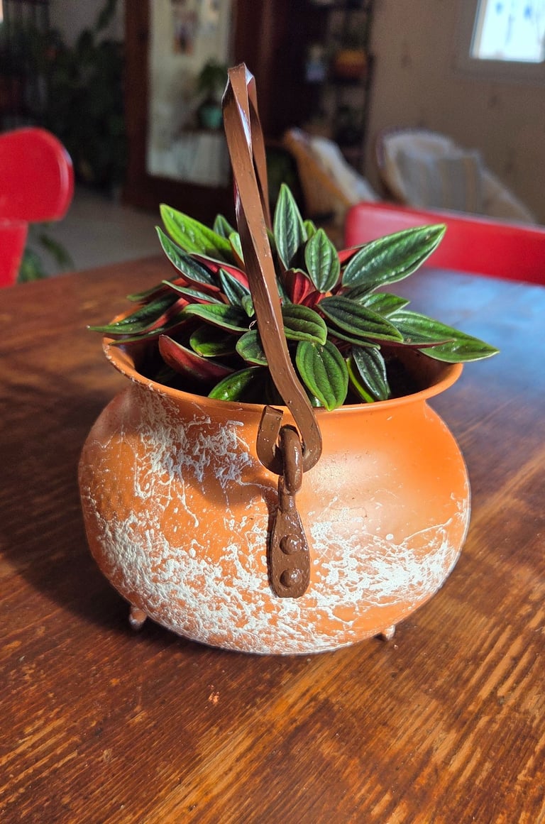 L'objet accueille un pied de "peperomia rouge", des billes d'argiles et du terreau.