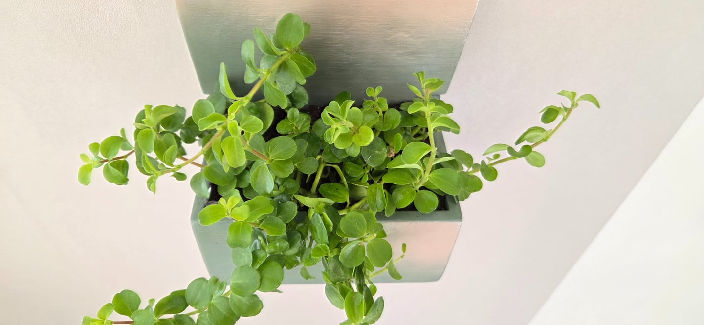 L'objet est étanchéifié avec du plastique recyclé et accueille un pied de "peperomia obtusifolia", des billes d'argiles et du terreau.