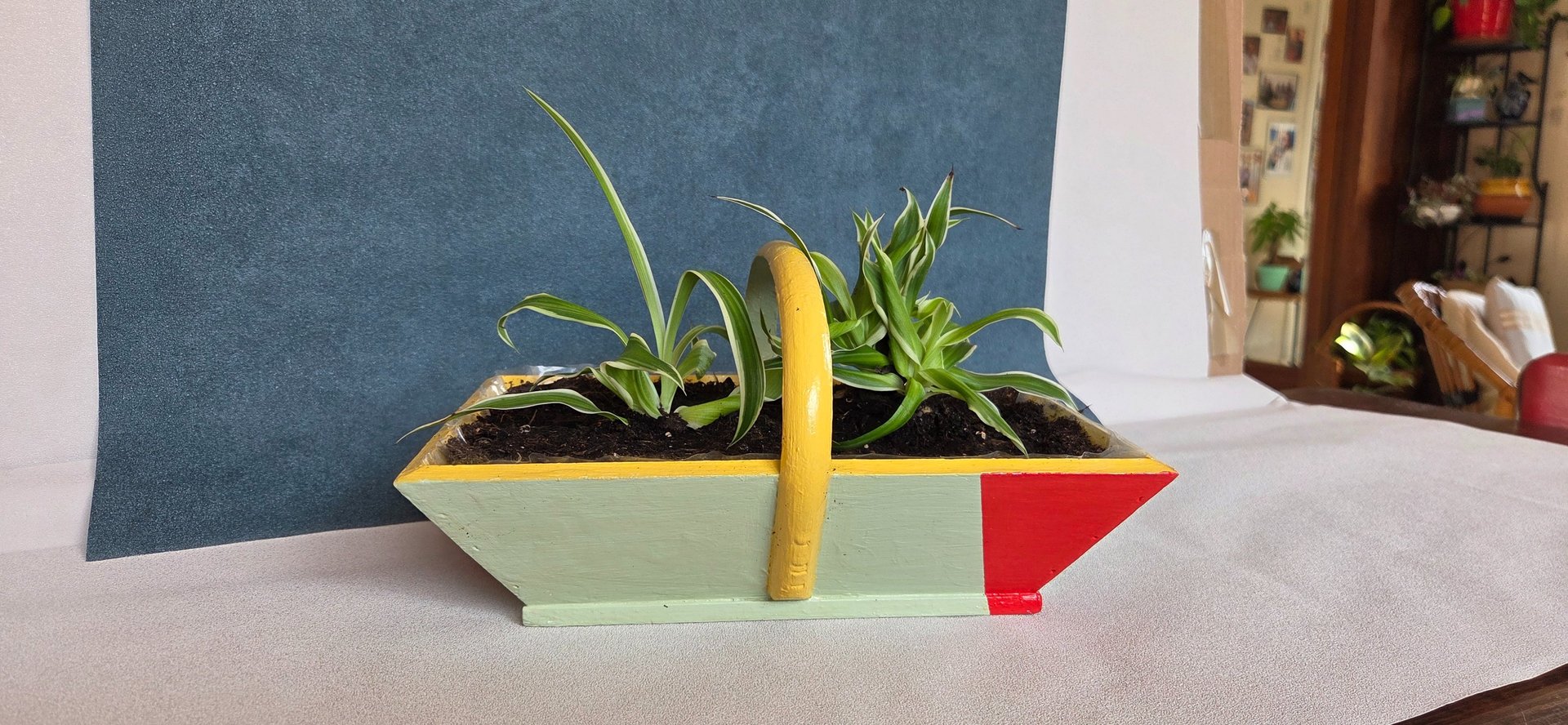L'objet étanchéifié avec du plastique recyclé accueille un pied de "plante araignée", des billes d'argiles et du terreau et des petits cailloux de déco.