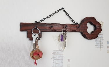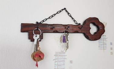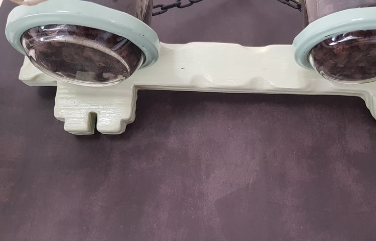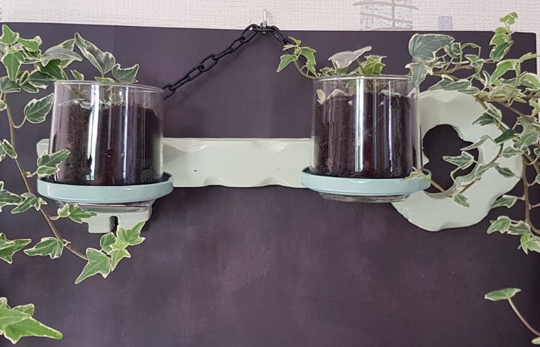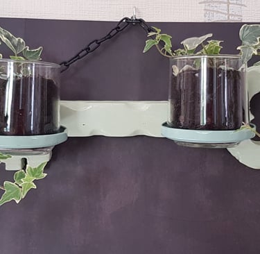 Support clé en bois, peint et vernis, avec socles des plantes fabriqués à partir de couvercles de bocaux percés et fixés avec des vis. Les verres sont mobiles pour pouvoir positionner les plantes selon votre goût.