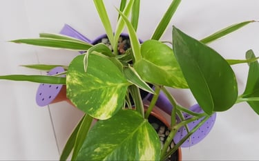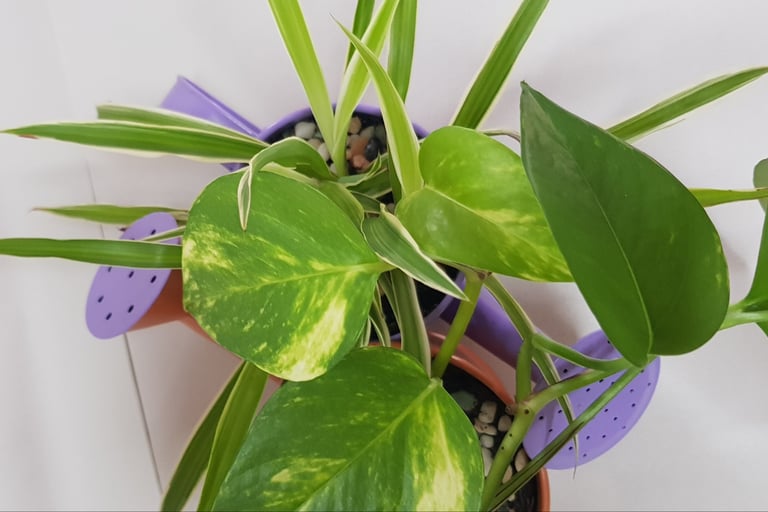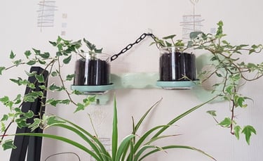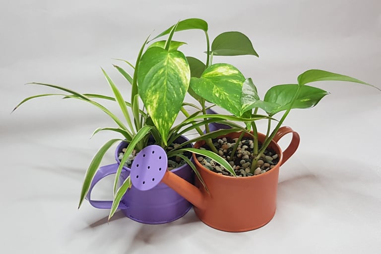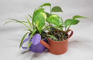 Chaque arrosoir accueille des plantes différentes : "Pothos" et "plante araignée", des billes d'argiles, du terreau et des petits cailloux déco.
