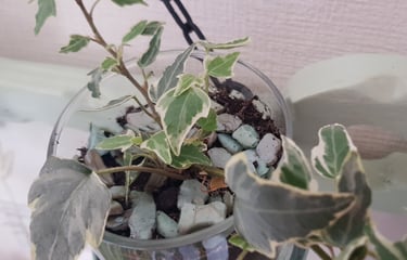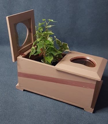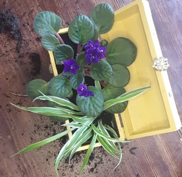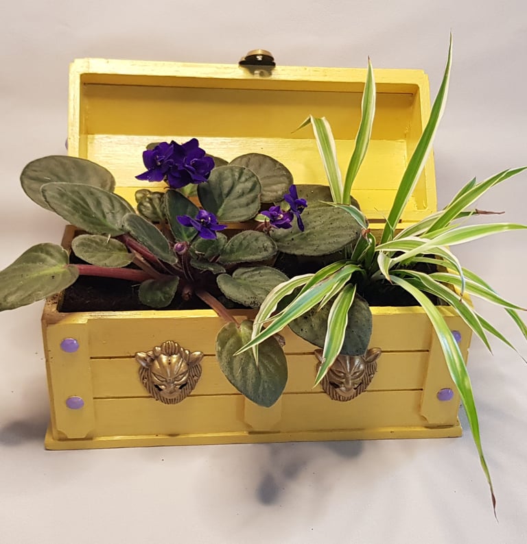 Chacun des deux compartiments intérieurs accueille une plante différente : "Saintpaulia" et "plante araignée", des billes d'argiles, du terreau.