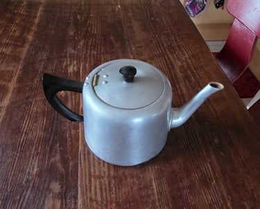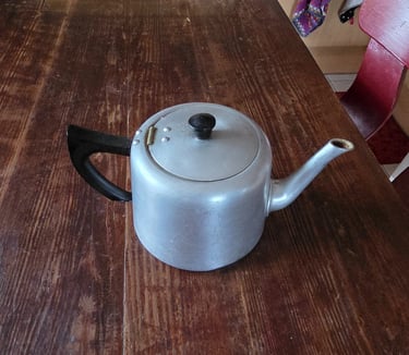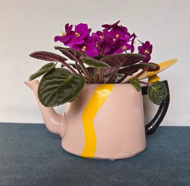 Une ancienne théière "années 60" en aluminium, nettoyé et peinte en couleur "rose ballerine" satin et "jaune bouton d'or" satin pour la partie aluminium. La anse est recouverte de chatterton noir.