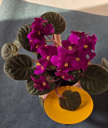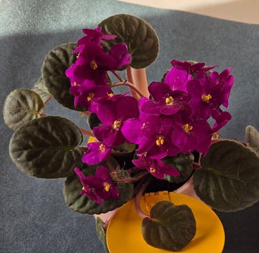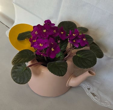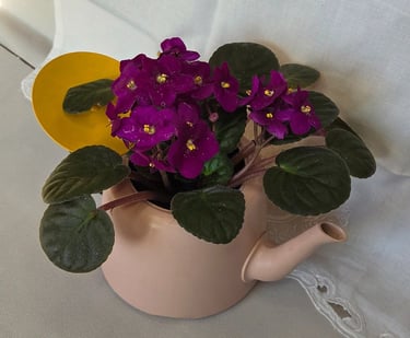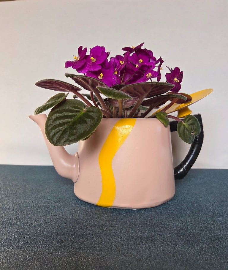 L'objet accueille un pied de St Paulia couleur fuchsia, des billes d'argiles et du terreau.
