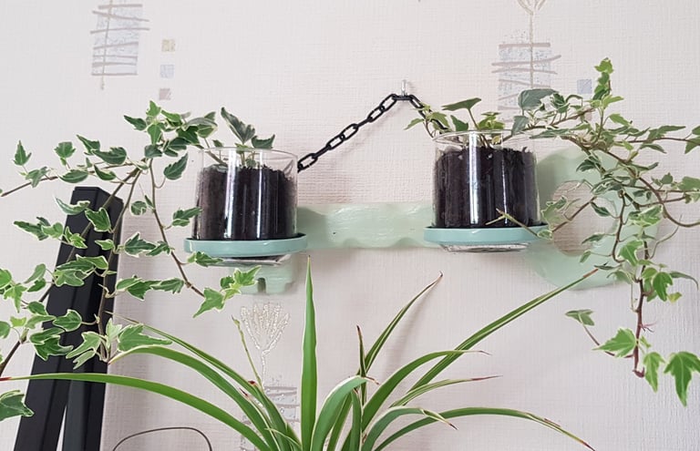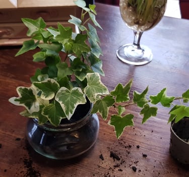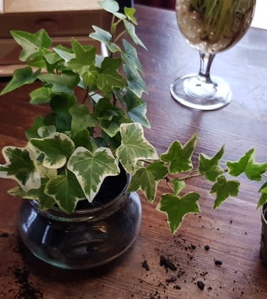 Les pots pour les plantes (lierre) sont des verres à eau contenant des billes d'argiles, du terreau et des petits cailloux de déco.