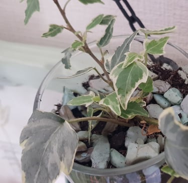 Un pot en verre collé à l'intérieur du coffre accueille des pieds de lierre, des billes d'argiles et du terreau.
