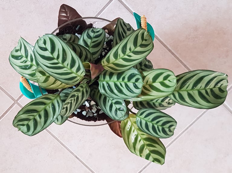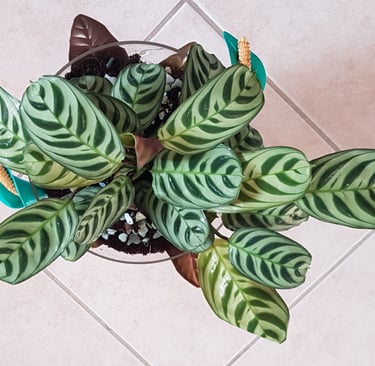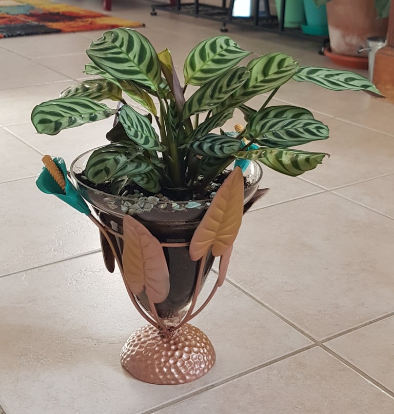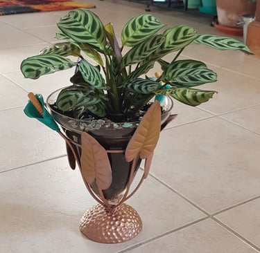 Le verre du photophore contient une plante "Calathéa Paon", des billes d'argiles, du terreau et des petits cailloux de déco.