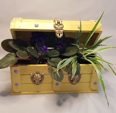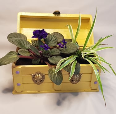 Un coffre à bijoux en bois, poncé, peint (jaune blé pour le bois, or et pourpre pour les ferrures et les clous apparents) et vernis, l'intérieur est étanchéifié avec des morceaux de plastique recyclé. J'ai ajouté des petits patins ronds sous le coffre pour éviter de rayer vos meubles.