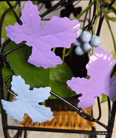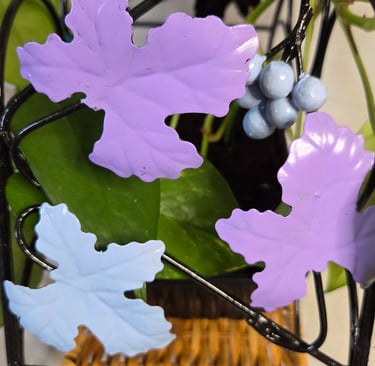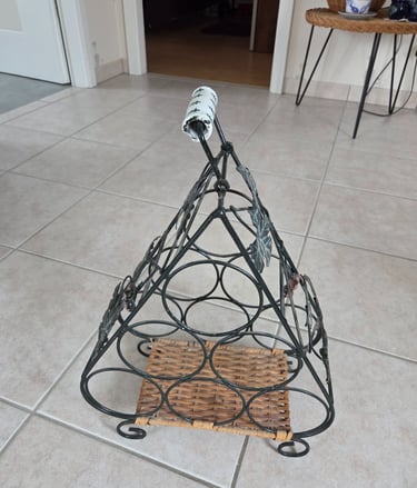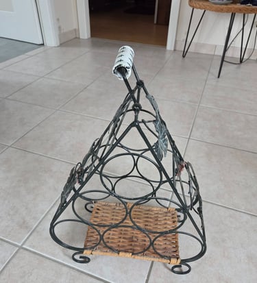 Un casier à bouteilles en métal "type fer forgé", peint en couleur "noir satiné" pour la structure, "pourpre satin", "Gentiane satin" et "argent" pour les feuilles et grappes de raisins.