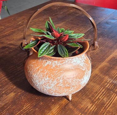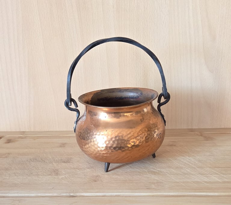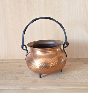 Un petit chaudron en cuivre, peint en couleur "terre cuite" et "blanc marbré" et peinture laquée "chocolat" pour la anse et ses attaches.