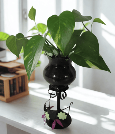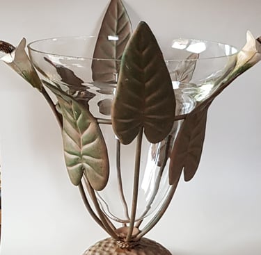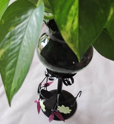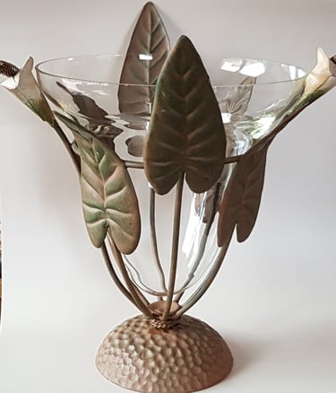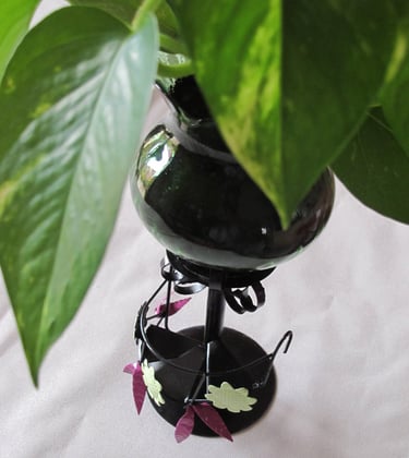 Un photophore en métal et verre, repeint en noir satiné pour la structure, en couleur "figue" et "vert anis" pour les feuilles et les fleurs.