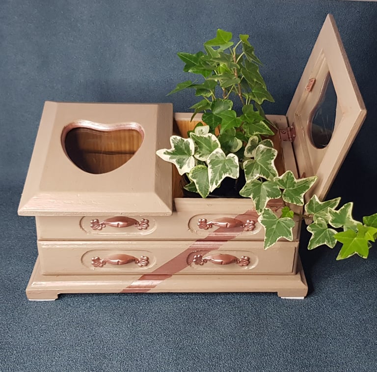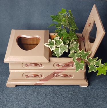 Un coffre à bijoux en bois avec 2 petites portes vitrées, poncé, peint en couleur "champignon" satiné et cuivré pour les rayures, les ferrures et les clous apparents, puis vernis. L'intérieur est tapissé de vinyle "imitation bois". J'ai ajouté des petits patins triangulaires sous le coffre pour éviter de rayer vos meubles.