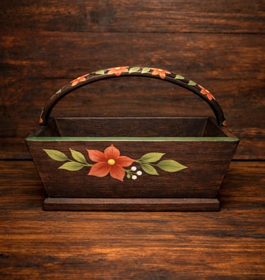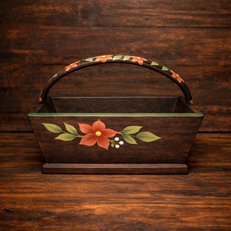 Un panier en bois, peint en couleur "vert à soie" et "épi de blé" pour la base et une touche de "rouge coquelicot" pour les motifs.