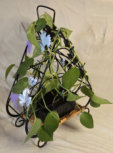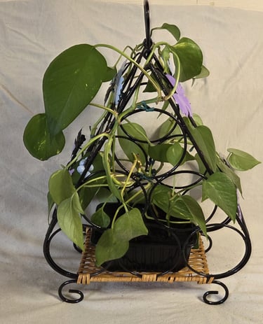 L'objet accueille dans un bac en plastique noir recyclé, 4 pieds de Pothos, des billes d'argiles et du terreau.