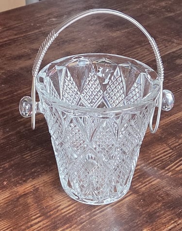 Un seau à glaçons en verre, peint en couleur "abricot" et "bouton d'or" sur certains losanges en relief, et en "cuivré" pour l'anse. Deux petits batônnets en bois maintiennent l'anse debout mais peuvent être enlevés au choix.