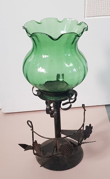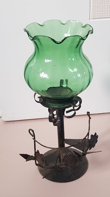 Un photophore en métal, nettoyé et peint (peinture aérosol cuivre et or, peinture laque déco satinée abricot et émeraude)