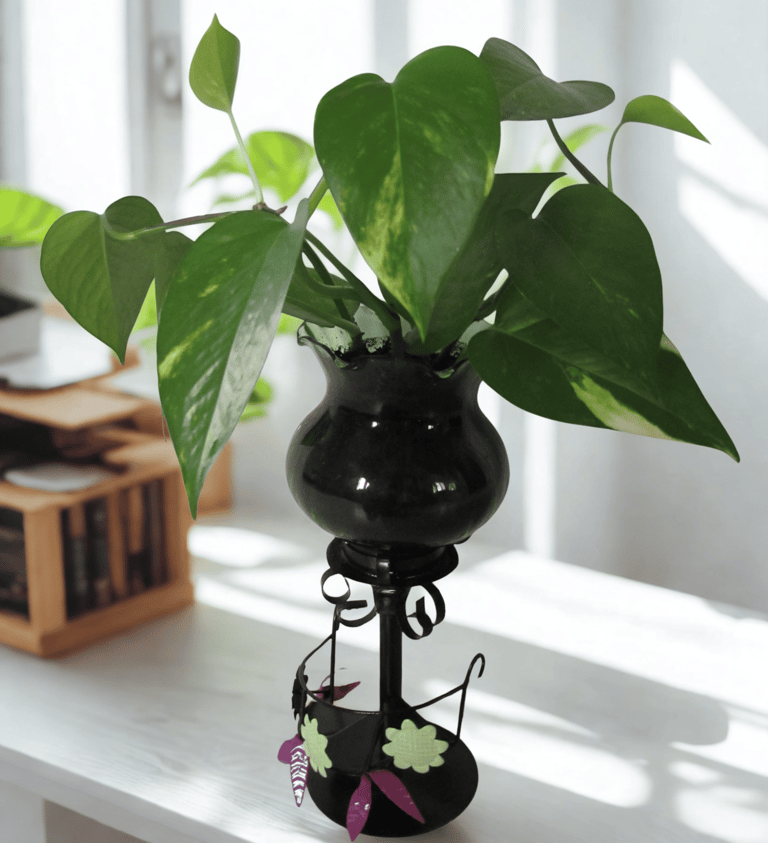 Le globe "tulipe" de couleur verte accueille des pieds de "pothos", des billes d'argiles et du terreau.